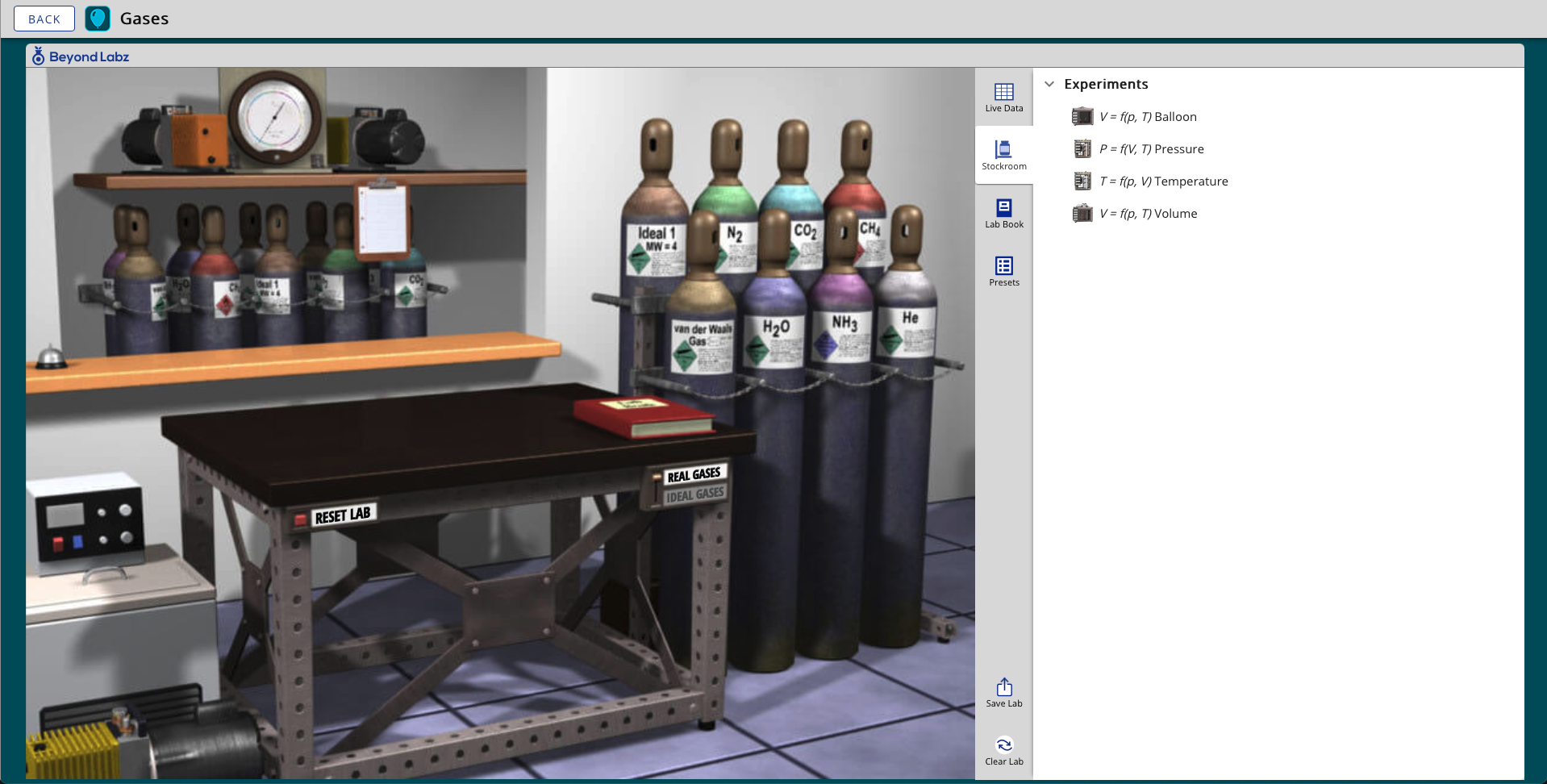 The gas experiments included in the simulated laboratory allow students to explore and better understand the behavior of ideal gases, real gases, and van der Waals gases (a model real gas). The gases laboratory contains four experiments each of which includes the four variables used to describe a gas: pressure (P), temperature (T), volume (V), and the number of moles (n). The four experiments differ by allowing one of these variables to be the dependent variable while the others are independent. The four experiments include (1) V as a function of P, T, and n using a balloon to reflect the volume changes; (2) P as a function of V, T, and n using a motor driven piston; (3) T as a function of P, V, and n again using a motor driven piston; and (4) V as a function of P, T, and n but this time using a frictionless, massless piston to reflect volume changes and using weights to apply pressure. The gases that can be used in these experiments include an ideal gas; a van der Waals gas whose parameters can be changed to represent any real gas; real gases including N2, CO2, CH4, H2O, NH3, and He; and eight ideal gases with different molecular weights that can be added to the experiments to form gas mixtures.