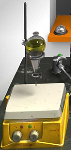 Once a reaction has reached completion it is quenched by adding an appropriate aqueous reagent. In the simulation, the reaction is stopped by selecting the separatory funnel from the lab rack and dragging the funnel to the reaction apparatus. This returns the various apparatus parts back to where they came from and places the reaction mixture in the funnel on the lab bench. The three aqueous reagents, H2O, 0.1 M NaOH, and 0.1 M HCl, are now active and can be added to the funnel by clicking and dragging a small bottle to the funnel. At this point, diethyl ether is also added to the funnel, there is assumed to be a shaking procedure (not shown in the simulation), and the compounds in the reaction mixture are partitioned into the appropriate organic and aqueous layers. Volatile compounds are lost in the workup process. Be aware that some explosions may occur during the shaking and partitioning procedure due to unstable compounds.