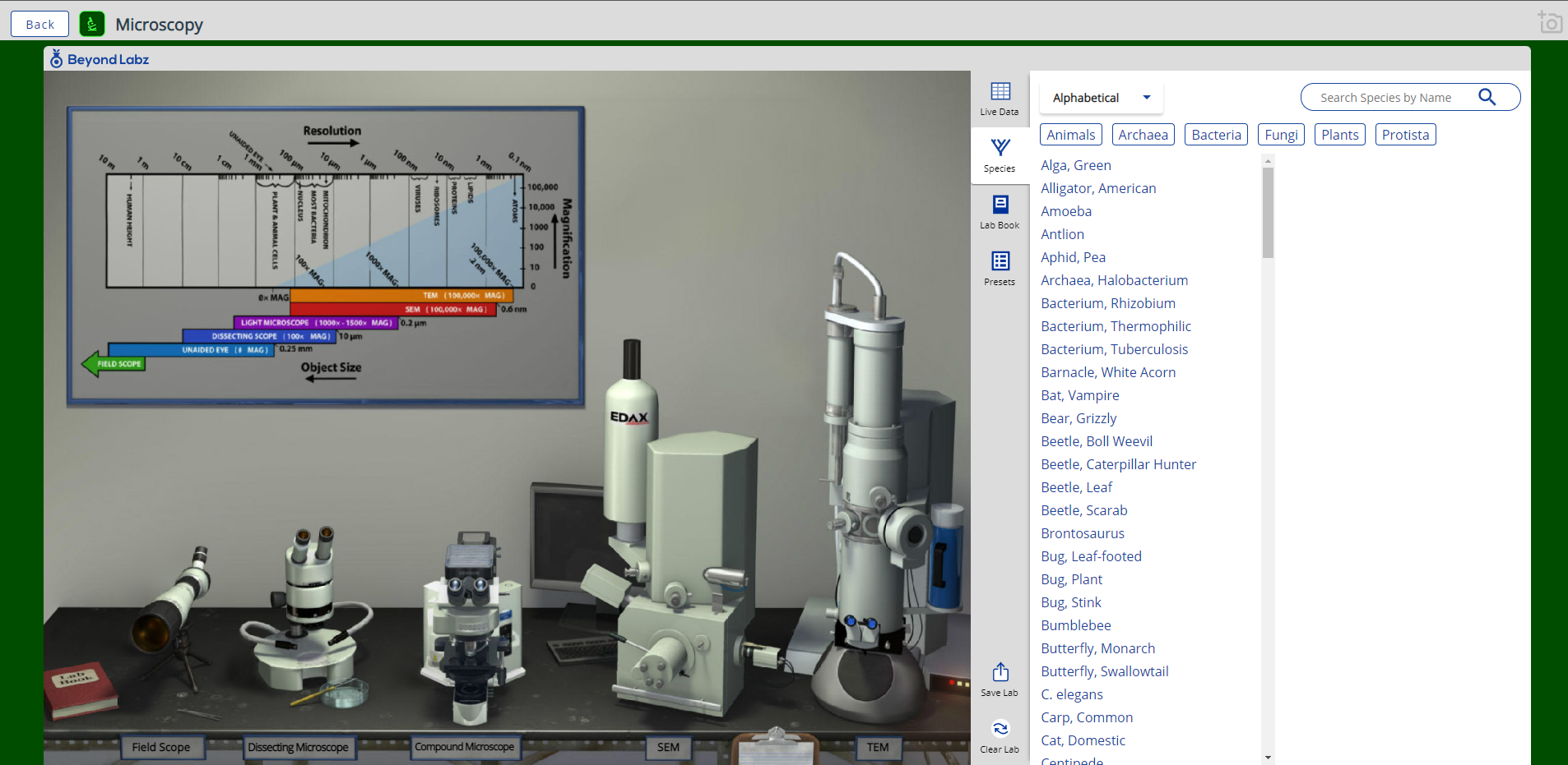 To use the laboratory, students select a species they wish to study using the species selector, which causes a thumbnail directory of microscope images belonging to the selected species to appear alongside the available microscopes. Each species may use a different set of microscopes depending on the size and type of species. Using the collection of thumbnail images, students can then enlarge these images for more careful viewing and analysis using the the Live Data display. The focus in this laboratory is on viewing and interpreting the images and not necessarily on sample or slide preparation techniques.