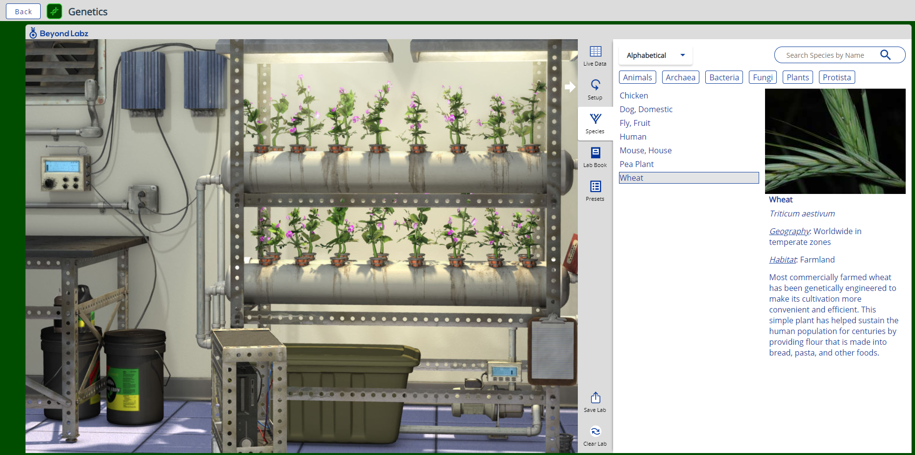The student is placed initially in a room containing a hydroponic system growing pea plants. The laboratory room will change as different species are selected.