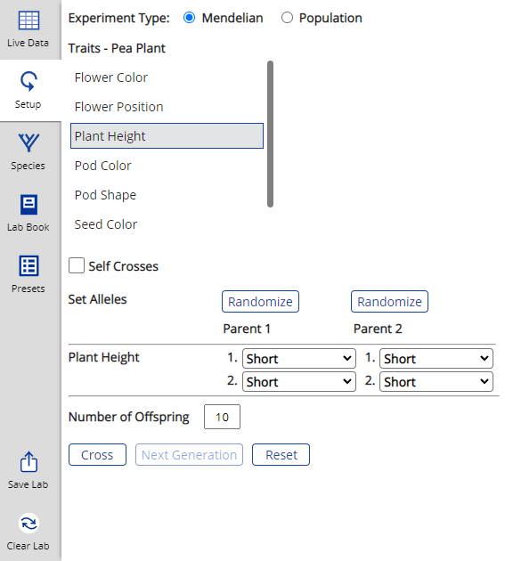 To use the laboratory, students must first select a species from the Species menu on the right hand side. Then select the Setup menu and choose either a Mendelian experiment or a Population experiment.