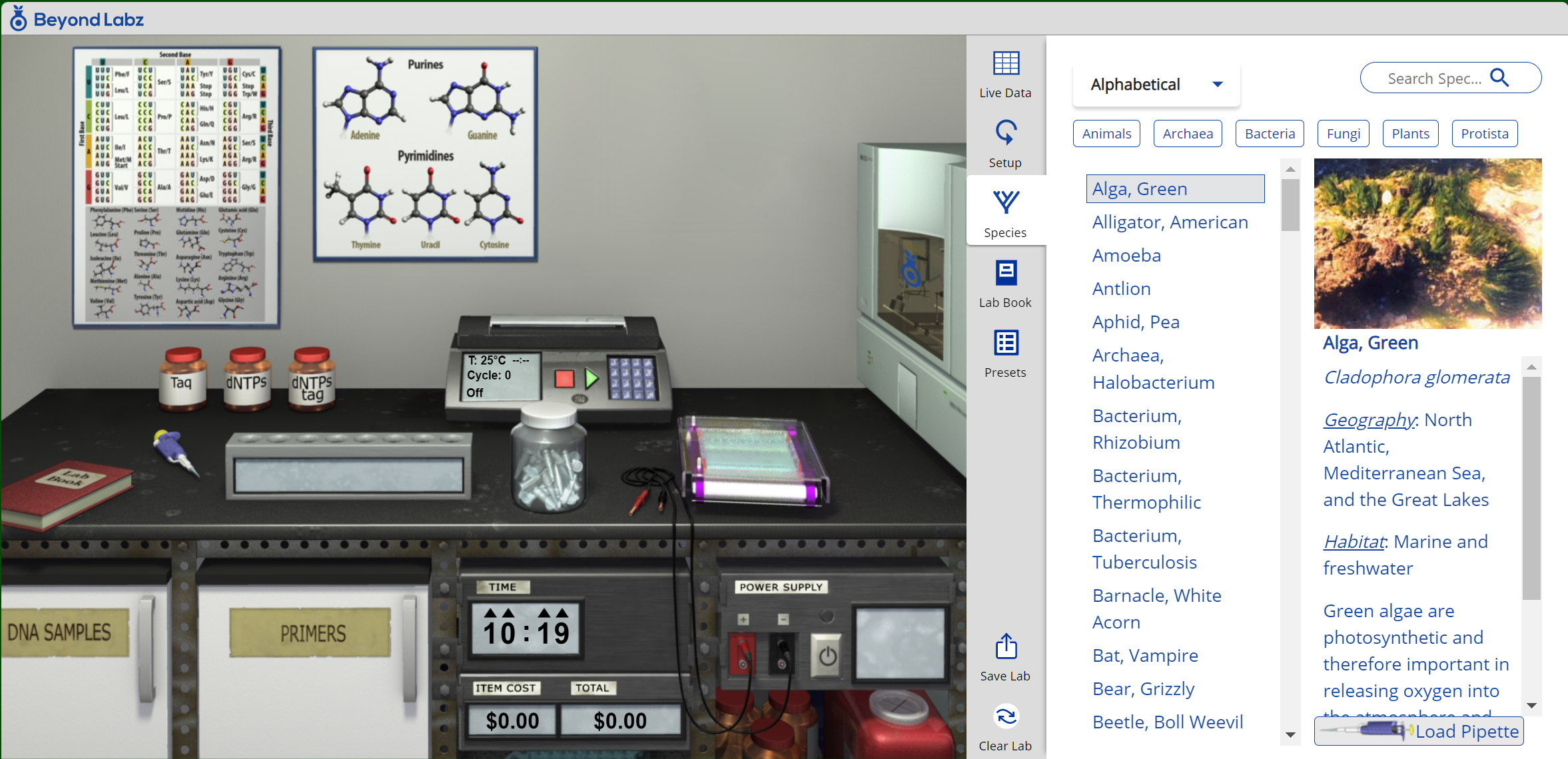 To use the laboratory, students can select up to eight microcentrifuge tubes and place them in a tube holder. Students can then select species using the species selector and for each selected species add a small DNA sample to any of the tubes in the tube holder using the micropipet. In addition to the DNA samples, students can also add Taq polymerase (Taq), nucleotides (dNTPs) or fluorescently tagged nucleotides (dNTPs tag), and selected primers to the tubes in preparation for amplification of a selected gene or segment by (PCR). Once the tubes have been prepared they can be moved to the PCR machine where the appropriate denaturation, primer annealing, and elongation temperature and dwell times can be configured for a PCR experiment. After the PCR run, samples of the amplified products can be placed in a well on an electrophoresis gel bed and a voltage applied to separate the products into bands to determine the approximate mass of the products. Once a successful amplification of the selected gene has been confirmed, then each amplified product can be placed in the automatic sequencer and the amplified gene sequence determined. Measured gene sequences can be saved to the lab book for further analysis and comparison with other sequences.